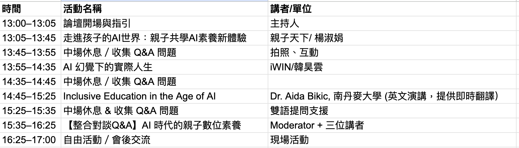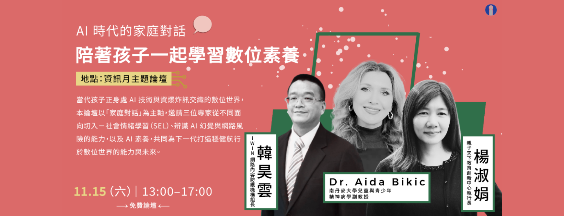 11/15(六)「AI 時代的家庭對話:陪著孩子一起學習數位素養」主題論壇